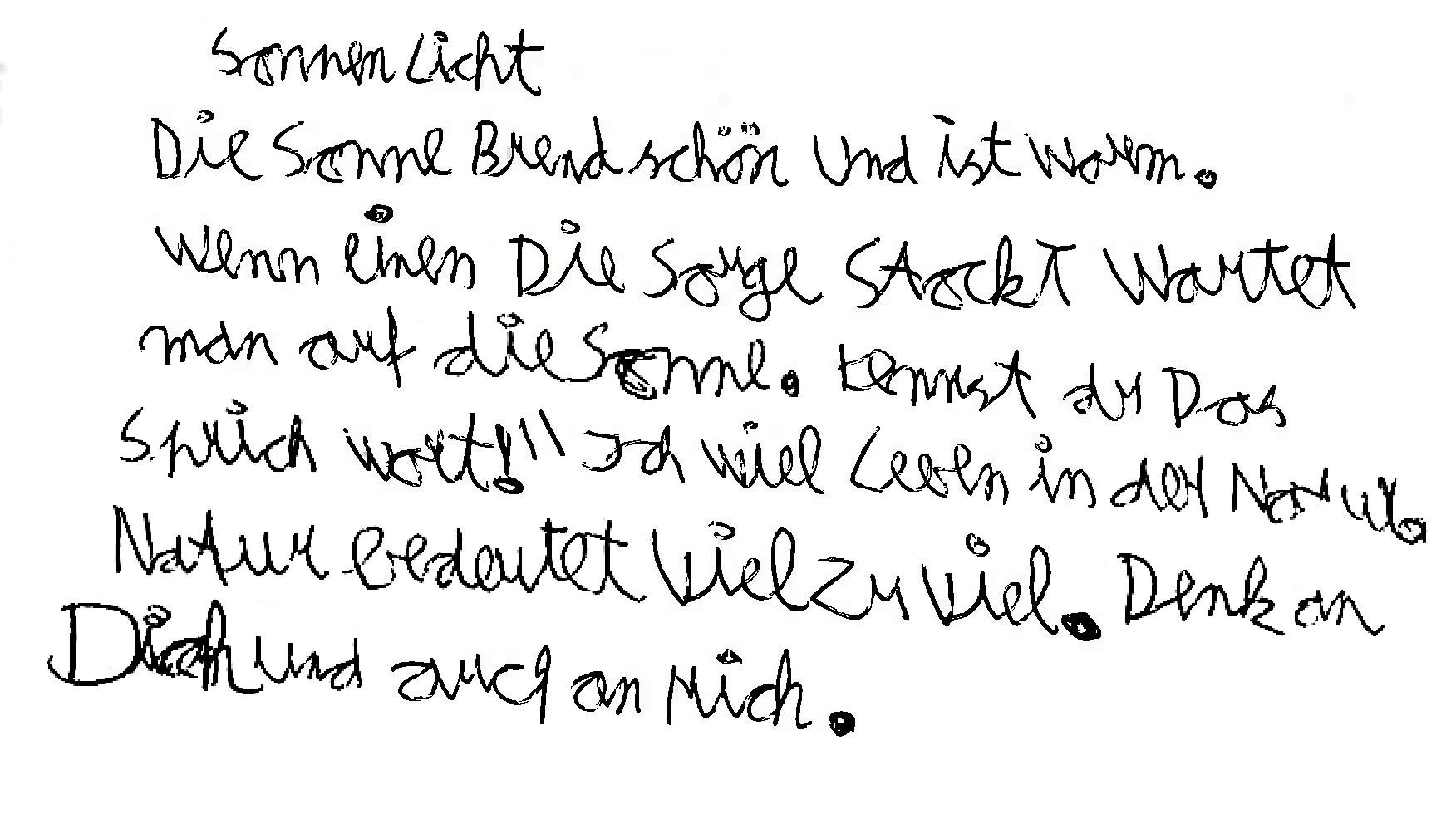 Ich habe viel Sonne im Herzen. Ich bin nie allein. Ich hab Glück so eine nette Familie zu haben. Nur die Ordnung mit den Papieren ist mein Problem.